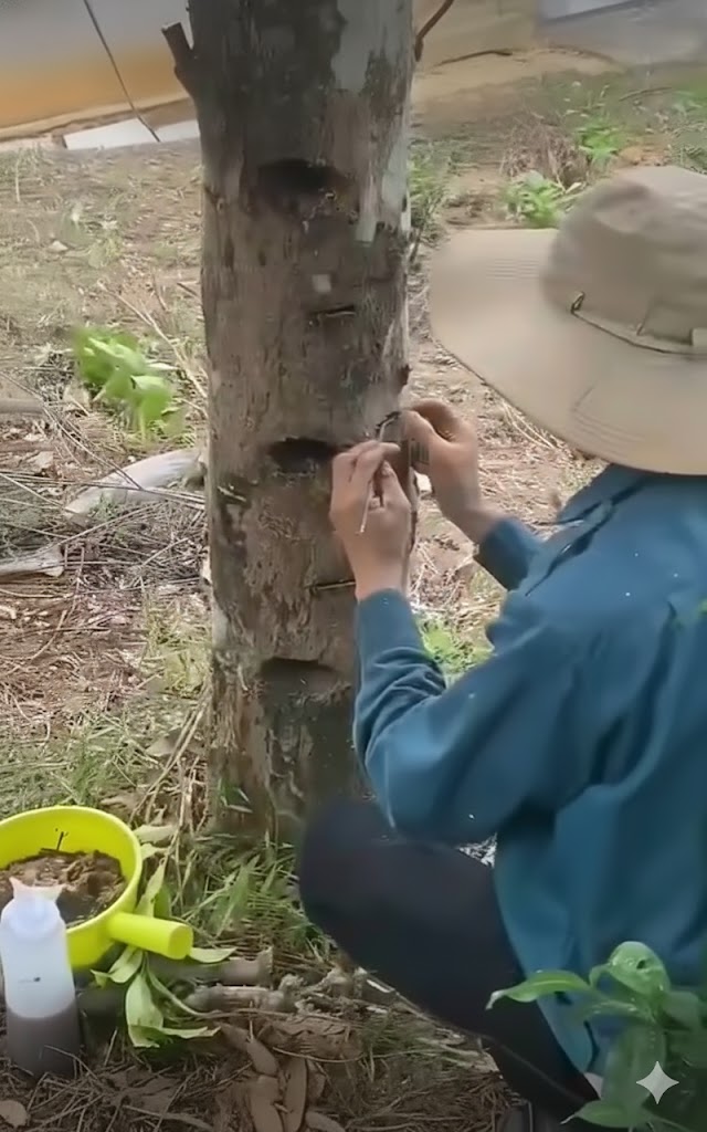 - Cấy men vi sinh độc quyền: Dung dịch men vi sinh (gồm các chủng nấm và vi khuẩn có lợi) được đưa vào thân cây. Những vi sinh vật này sẽ tương tác với nhựa cây, thúc đẩy quá trình chuyển hóa gỗ thành trầm hương tự nhiên.