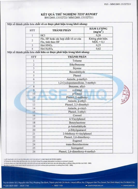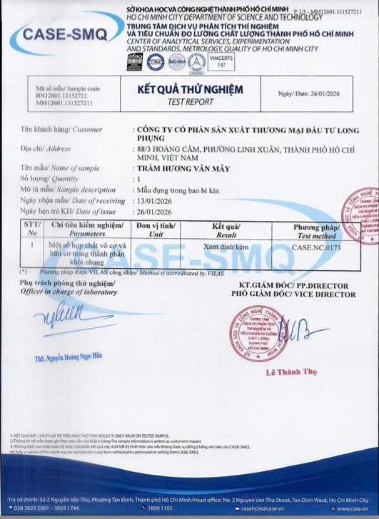 Toàn bộ dòng trầm vi sinh (trầm vân mây) do Thuỷ Trầm phân phối đã được kiểm định tại đơn vị kiểm nghiệm độc lập, với các nhóm chỉ tiêu quan trọng dành cho sản phẩm đốt – xông hương.